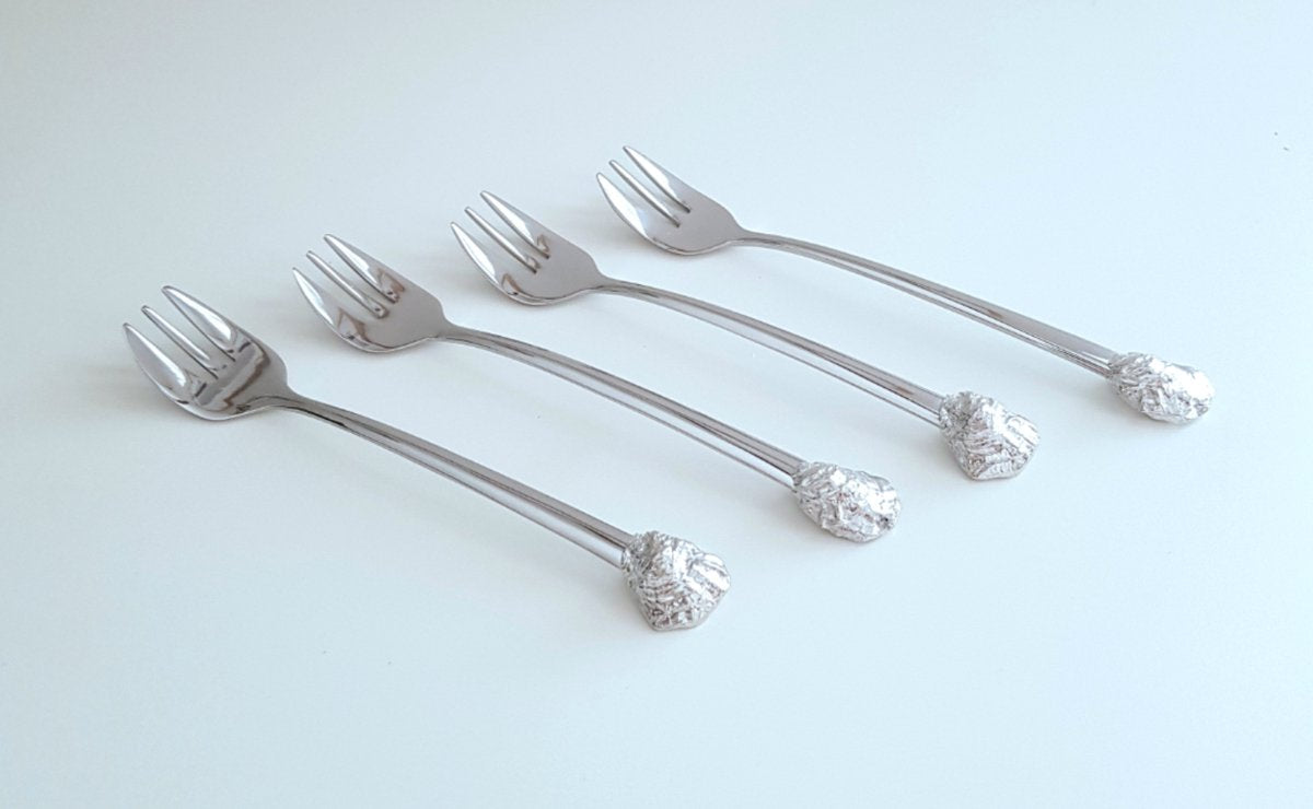 De Anovi Oestervorkjes zijn ambachtelijk vervaardigd in Nederland en geïnspireerd op de natuurlijke vormen van oesterbroed uit de Oosterschelde. De handgreep van zuiver tin ligt prettig in de hand, terwijl het roestvrijstalen vorkgedeelte zorgt voor duurzaamheid en gebruiksgemak. Een perfecte balans tussen vorm en functie.