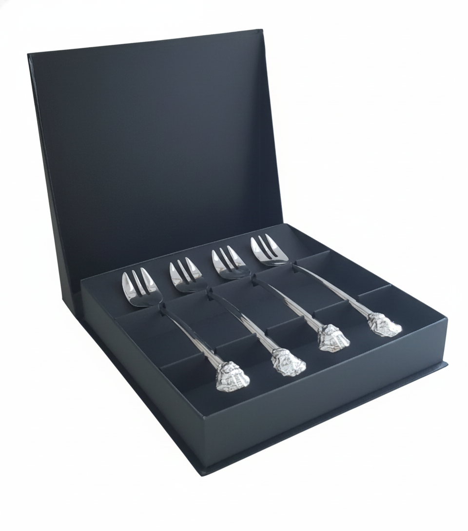 Verpakt in een stijlvolle zwarte geschenkdoos, zijn deze vorkjes een prachtig cadeau voor fijnproevers en liefhebbers van de zee. Een bijzonder geschenk dat klasse, vakmanschap en een vleugje maritieme elegantie uitstraalt — ideaal voor feestdagen, diners of speciale gelegenheden.