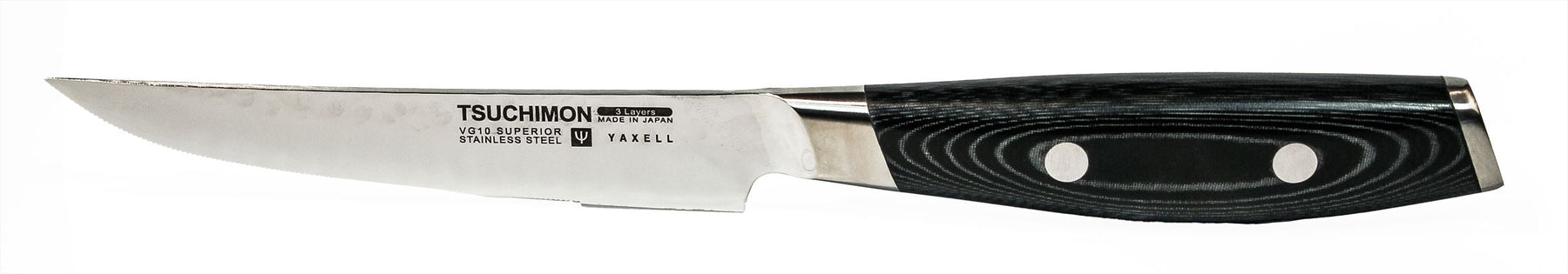 YAXELL Set van 4 steakmessen serie Tsuchimon is voor de echte liefhebber van kwaliteitsmessen met een rustieke uitstraling, de harde kern verzekert langdurige scherpte en het canvas-micarta heft geeft een uitstekende controle over dit vlijmscherpe mes.