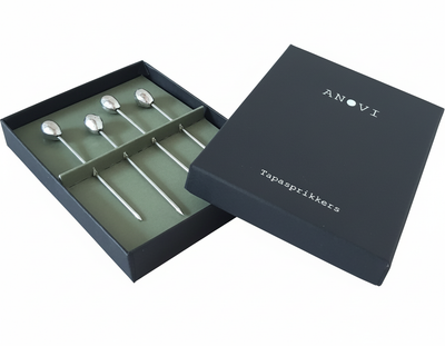 Anovi Tapasprikkers Olijfmotief - Handgemaakt uit Zilvertin - 8 cm - Set van 4 in Luxe Geschenkdoos